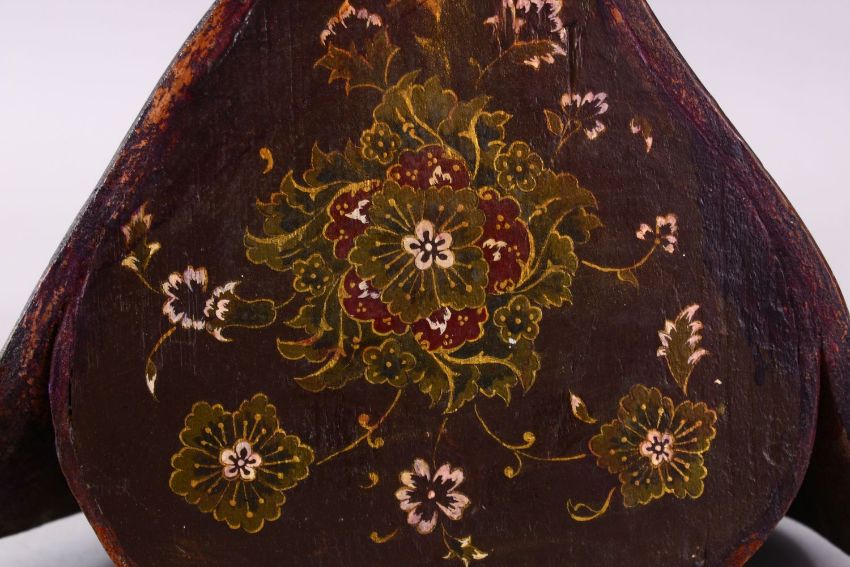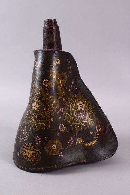 AN OTTOMAN WOOD & LEATHER DECORATED POWDER / WATER FLASK, the body with incised and polychrome decorated details of flora, 27cm x 22cm