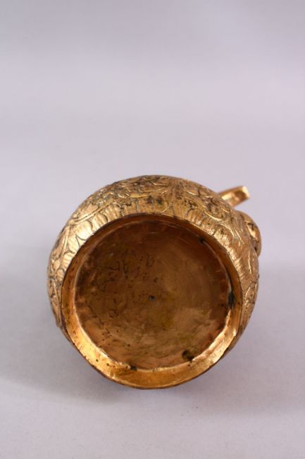 AN EARLY 18TH CENTURY OTTOMAN GILDED COPPER TOMBAK COFFEE POT, decorated with raised floral decoration, 17.5cm