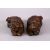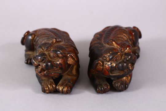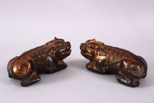 TWO CHINESE BRONZE FIGURES OF LION DOGS, each gilded with traced of red lacquer, in recumbent pose, 12cm