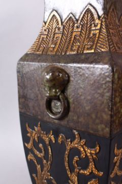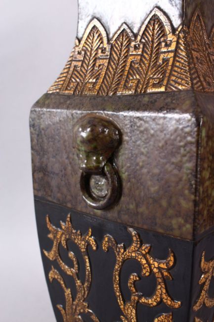 A CHINESE ARCHAIC STYLE PORCELAIN TWIN HANDLE VASE, with moulded twin handles of lion dogs and rings, with a gilded archaic floral decor, six character mark to base, 43cm high.