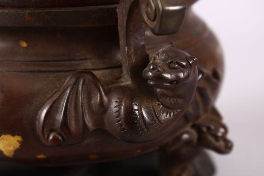 A CHINESE BRONZE INCENSE BURNER, COVER & STAND, the body with gold splash decoration with twin beast and funghi handles, and three chilong feet, the cover carved with bats and symbols with a carved jade finial, with a carved hardwood stand, overall 18cm high x 19.5cm wide.
