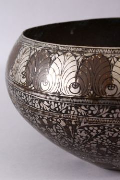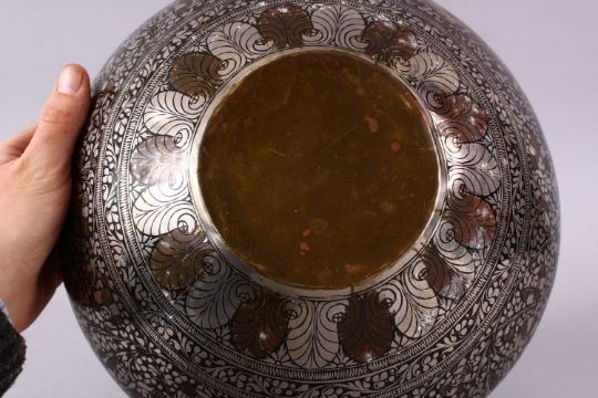 A 19TH / 20TH CENTURY INDIAN INLAID BOWL, the body of the bowl with floral white metal inlaid decoration, 30cm diameter.