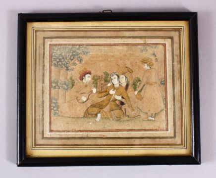 A FINE 17TH CENTURY INDIAN OR PERSIAN MINIATURE PAINTING depicting a couple in a garden setting with a musician and an attendant, overall size 16cm x 19cm.