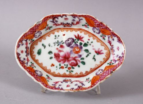 AN 18TH CENTURY CHINESE EXPORT FAMILLE ROSE PORCELAIN DISH, decorated with with native formal flora, 12.5cm.