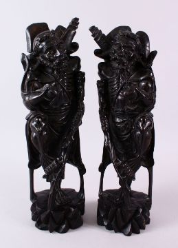 A LARGE PAIR OF 19TH CENTURY CHINESE SILVER COLOUR WIRE INLAID FIGURES OF SAGES, the mirrored pair of figures inlaid with silver coloured metal inlay, depicted holding a bat in his hand, upon a rocky formed base with his staff, 44cm high