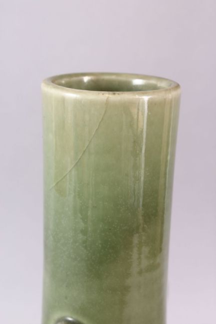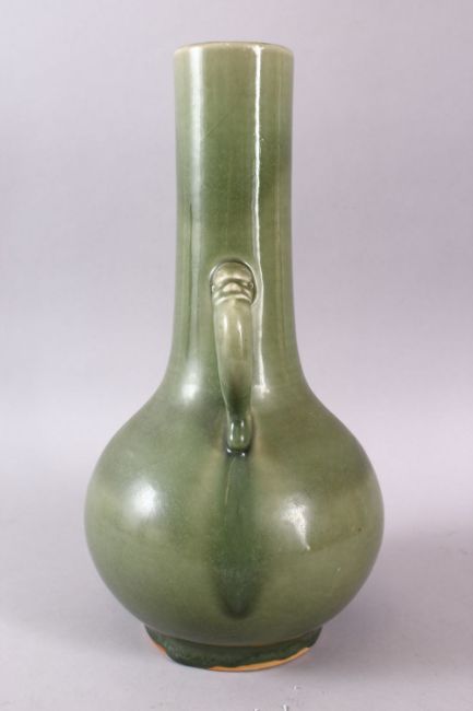 A CHINESE CELADON GLAZED TWIN HANDLE PORCELAIN VASE, with twin elephant mask handles, base drilled, 36cm