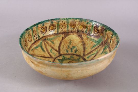 A GOOD IRAN STYLE POTTERY BOWL, decorated with green & biscuit grounds with floral motifs, 21cm.