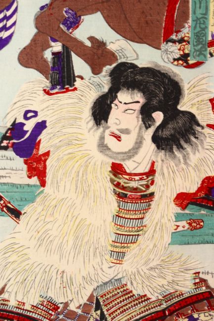 A JAPANESE MEIJI PERIOD WOOD BLOCK PRINT TRIPTYCH - KUNICHIKA TOYOHARA 1835 -1900 - THREE WARRIORS KABUKI- depicting three warriors, one lifting a horse aloft, each signed and sealed, mounted for framing, overall 100cm x 59cm