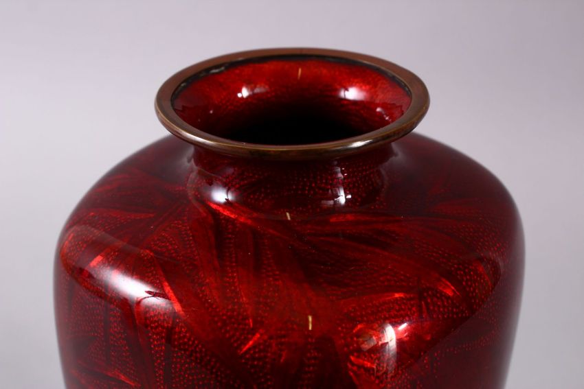 A JAPANESE MEIJI PERIOD BASSE TAILLE CLOISONNE VASE BY KUMENO TEITARO, the red glaxe over decoration of birds and bamboo, the base with an artist signature, 25cm high x 12cm wide.