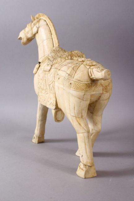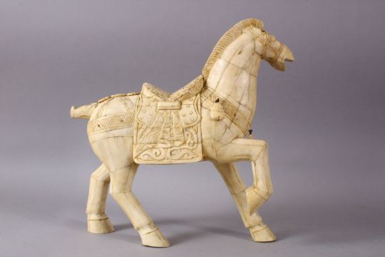 A LARGE 19TH / 20TH CENTURY CHINESE CARVED SECTIONAL BONE FIGURE OF A TANG STYLE HORSE, stood in a striding pose with one foot up, bearing a grin, with carved saddle details and hanging decorations, formed from many carved sections, 32cm high x 32cm wide.