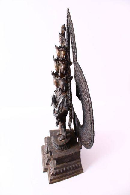 A LARGE CHINESE BRONZE FIGURE OF A MULTI HEAD & ARM DEITY / BUDDHA, stood upon a pedestal / lotus base, with a halo verso, multi arms holding objects, 69cm high x 43cm wide.