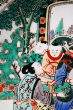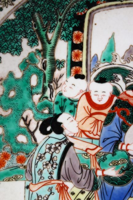 A 20TH CENTURY CHINESE FAMILLE VERTE PORCELAIN DISH, painted with figures playing musical instruments in a landscape setting, 20cm diameter.