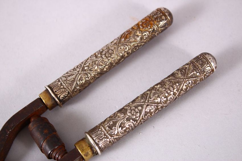 A PAIR OF 19TH CENTURY CURLING TONGS, with Thai embossed silver handles, 22.5cm long.