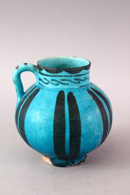 A GOOD EARLY ISLAMIC RAQQA POTTERY EWER, with a blue glaze and decorated striping, 16cm.