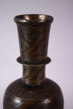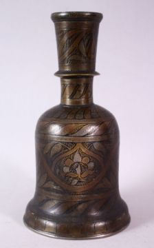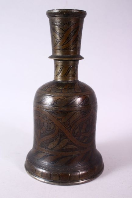 AN ISLAMIC ENAMEL DECORATED BRASS HUQQA BASE, 23cm high.