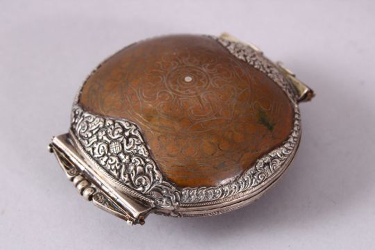 A FINE 18TH/19TH CENTURY SRI LANKAN SILVER INLAID COPPER LIME BOX, the mount with chased and engraved decoration, 8.5cm wide.