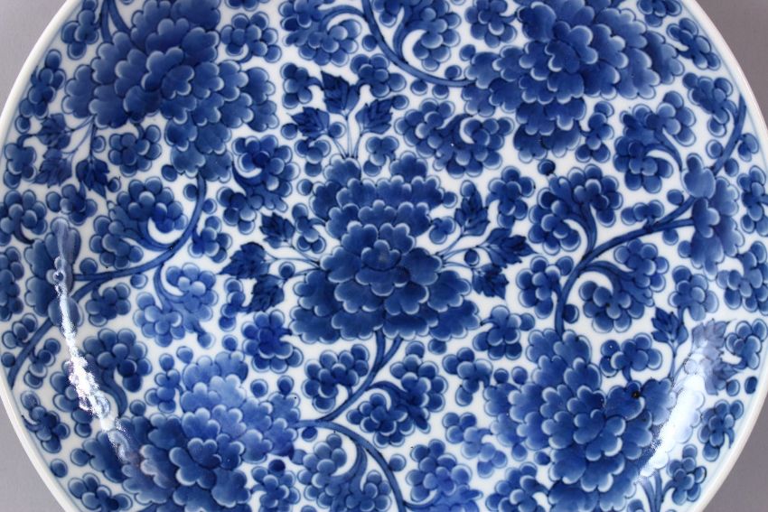 A CHINESE BLUE & WHITE FLORAL PORCELAIN DISH, with blue floral decoration, the base with a mark, 27.5cm