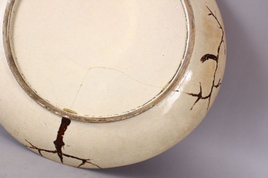 A LARGE JAPANESE MEIJI PERIOD SATSUMA EARTHENWARE CHARGER - SAMURAI & POEM, the large charger depicting a famous story of the samurai writing a poem upon a tree, in a native landscape with gilt raised decoration, 47.5cm (AF)