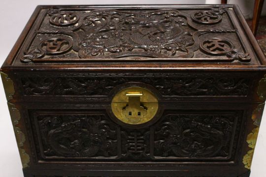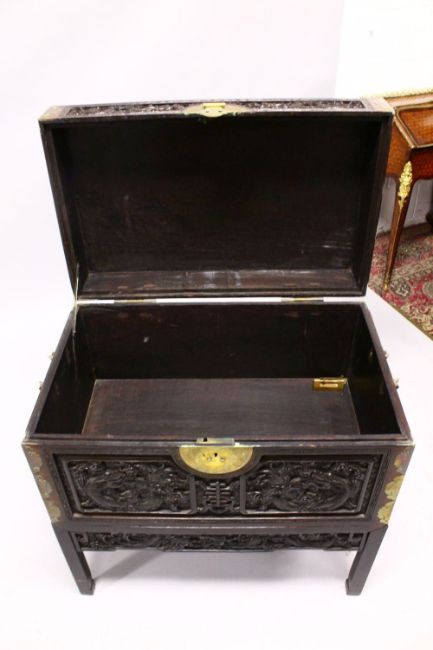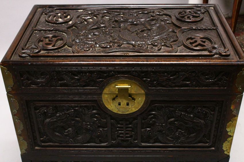 A GOOD 19TH CENTURY CHINESE CARVED HARDWOOD / HONGMU DRAGON CARVED LIDDED CHEST, the panels of the chest carved deeply to depict panels of dragons and bats, stood upon its similarly carved stand, 78cm high x 78cm wide x 48.5cm deep.