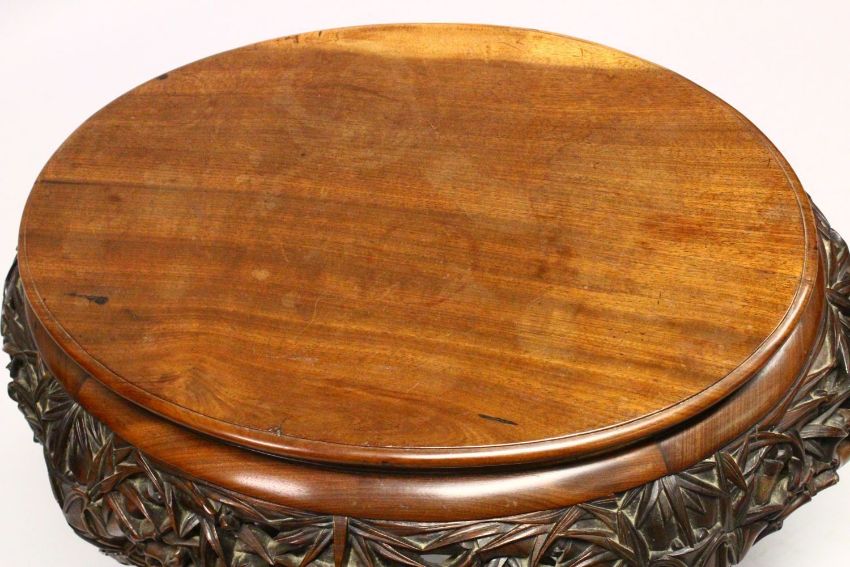 A LATE 19TH CENTURY CHINESE HARDWOOD OVAL TABLE, plain top, supported on pierced and carved frieze on similarly carved legs, united by an 'X' shaped stretcher, 70cm long, 54cm wide, 57cm high.