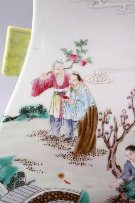 A CHINESE FAMIILE ROSE PORCELAIN HU SHAPED TWIN HANDLE IMMORTAL VASE, decorated with scene of immortal figures in landscapes, upon deer, holding funghi of immortality, peach branches, ruyi and scrolls, with surrounding cloud decoration, with twin rectangular form handles, the base with an iron red qianlong seal mark, 26cm x 17cm