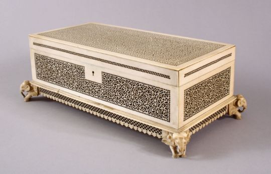 A VERY GOOD 19TH CENTURY INDIAN IVORY CASKET, with finely pierced hinged cover, sides and skirting, the feet well carved in the form of elephants, 10cm high, 29cm long, 15.5cm deep.