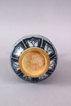 A CHINESE BLUE & WHITE MING STYLE PORCELAIN FLARED VASE, decorated with ducks amongst lotus, base unglazed, 14.5cm high.