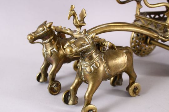 AN 18TH CENTURY INDIAN BRASS CHILDS TOY CHARIOT, 32cm long.