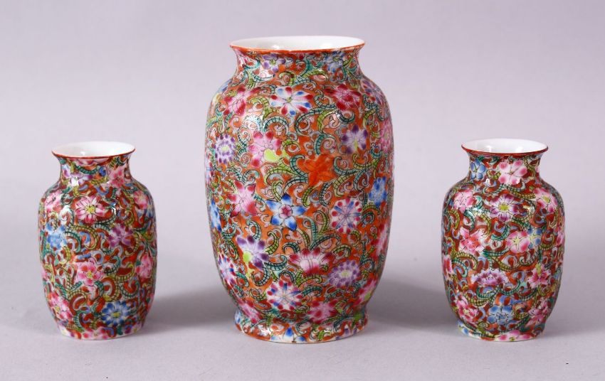 A GARNITURE OF THREE SMALL 19TH/20TH CENTURY CHINESE MILLIFLEUR VASES, the bodies decorated with the typical millifleur style, blue four character mark to the base, largest vase 10cm high, the other two vases 6.5cm.