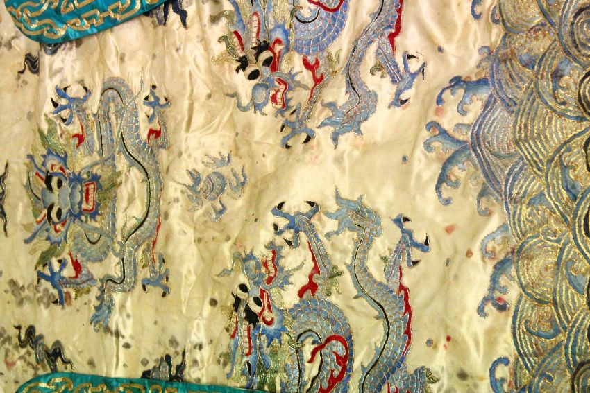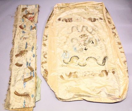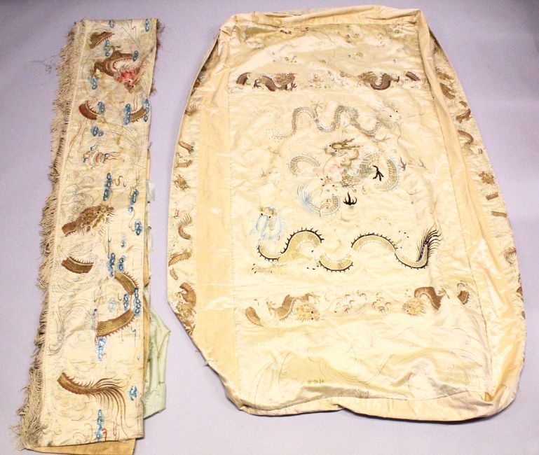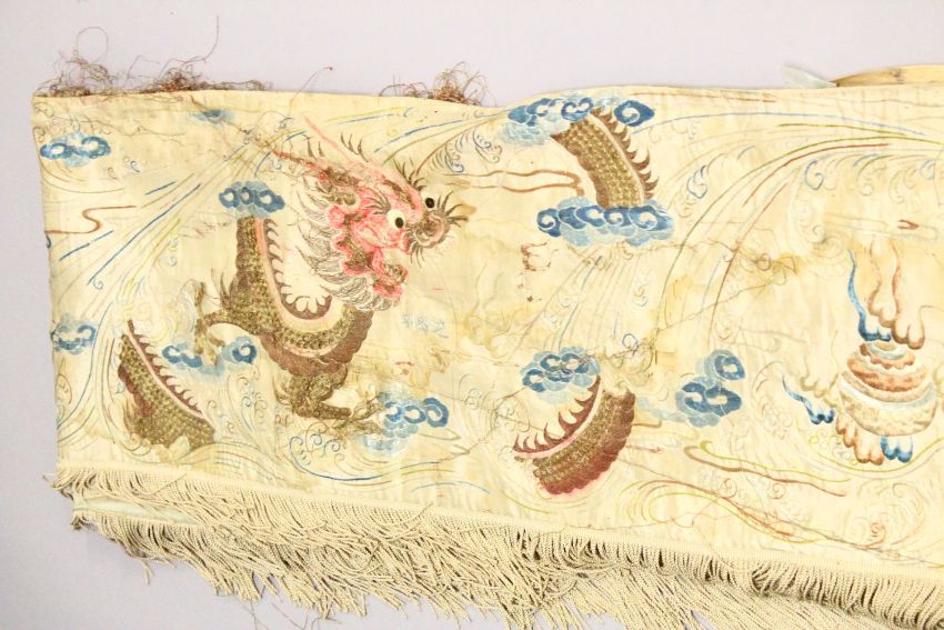 A 19TH CENTURY CHINESE MIXED LOT OF EMBROIDERED DRAGON SILK WORKS, Consisting of an ebroidered silk dragon robe, depicting dragons amongst waves and clouds upon a beige ground, another silk embroidered textile depicting dragons amongst clouds with calligraphy, also another similar silk dragon embroidery chasing pearls with tassel (3) various sizes