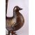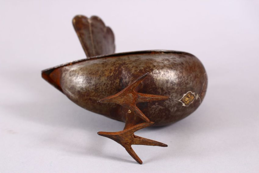 A 19TH CENTURY PERSIAN QAJAR SILVER AND GOLD INLAID STEEL MODEL OF A BIRD, 18cm high.