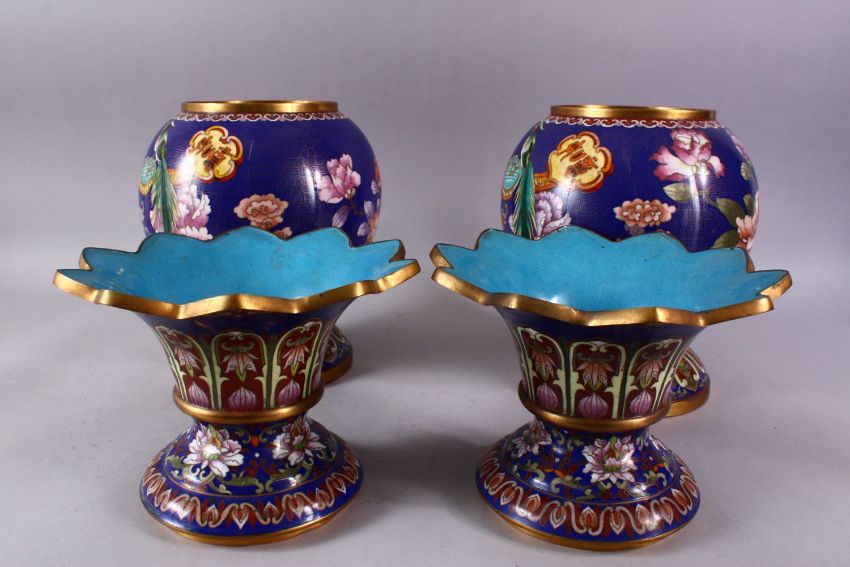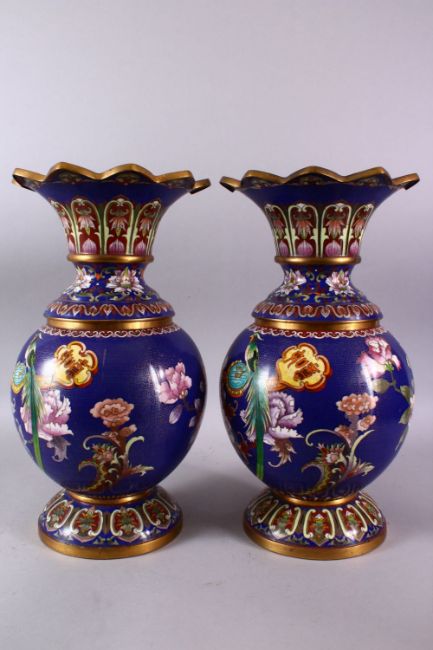 A PAIR OF 19TH/20TH CENTURY CHINESE CLOISONNE VASES, the bodies decorated with displays of native flora with birds and ruyi sceptre with calligraphy upon a deep blue ground, under a flared rim covers, overall 41cm high.