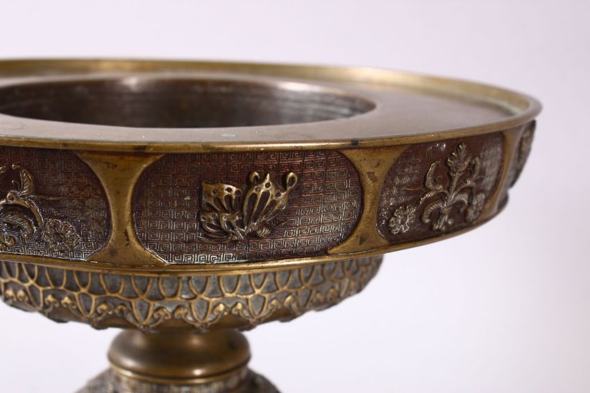 A JAPANESE BRONZE TRI ELEPHANT CENSER, the feet formed of three elephants with dragons, with panels of butterfly and flora, with a seal tablet to lower section, 18cm high x 26cm diameter