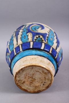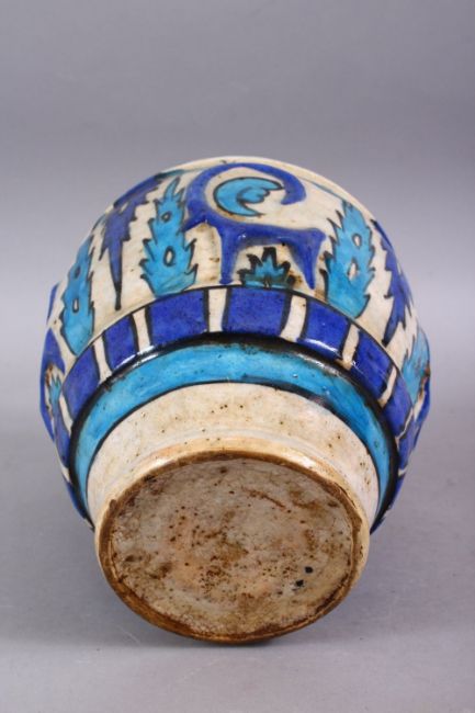 A GOOD PERSIAN BLUE & WHITE POTTERY VASE, decorated with moulded formal floral design, 23cm high.