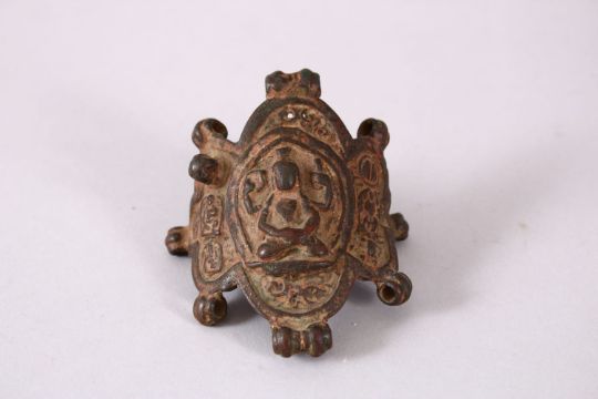 AN EARLY INDIAN BRONZE AMULET, possibly 12th Century, cast with a seated Buddha, 7cm wide.