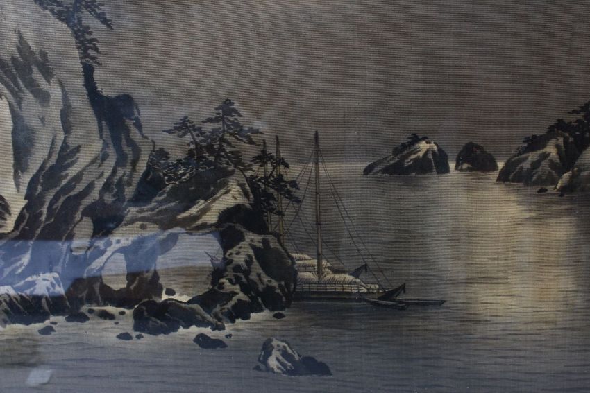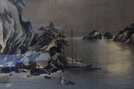A FRENCH MADE JAPANESE STYLE CARVED HARDWOOD FIRE SCREEN SIGNED GABRIEL VIARDOT, the fire screen carved in openwork with a central dragon sitting to the top, stood upon four claw feet, the screen containing a Japanese Meiji period painted silk picture of a moonlit waterside landscape section, the lower verso section with the makers signature, 100cm high x 83cm wide.