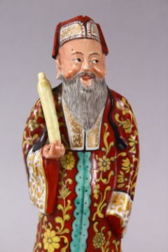 A 19TH / 20TH CENTURY CHINESE FAMILLE ROSE PORCELAIN FIGURE OF AN IMMORTAL, stood upon a wood style base holding a scroll, 22cm.
