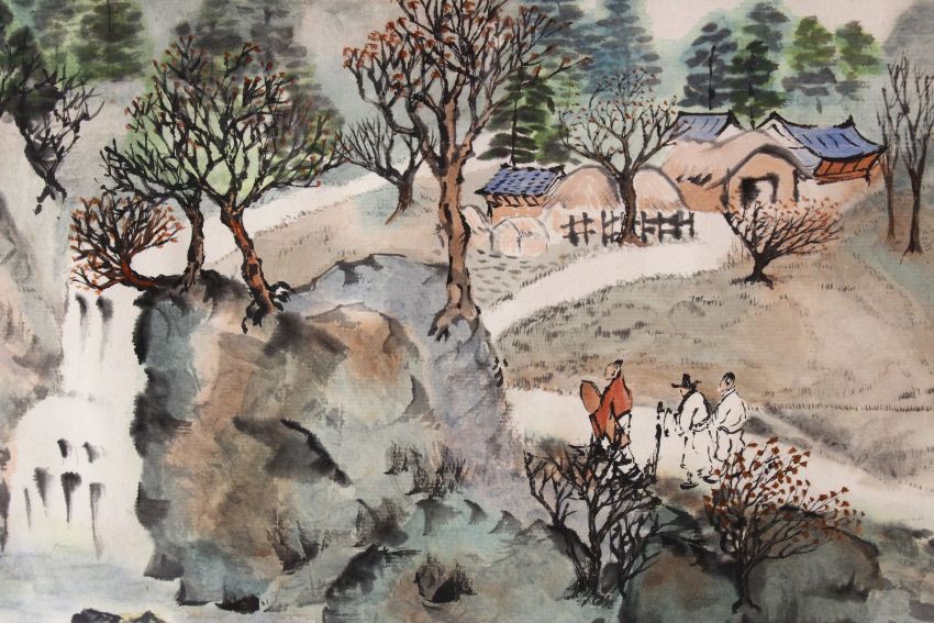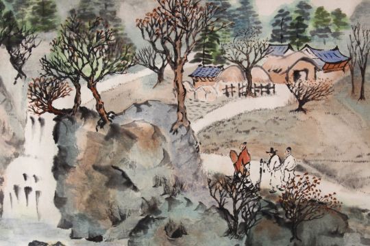 A CHINESE FRAMED PAINTING OF A NATIVE LANDSCAPE SCENE, depicting a native waterside landscape scenes with mountains, 83cm x 46cm.