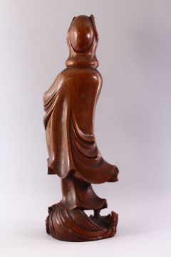 A GOOD LARGE CHINESE CARVED WOOD FIGURE OF GUANYIN, standing on a dragon, 55cm high.