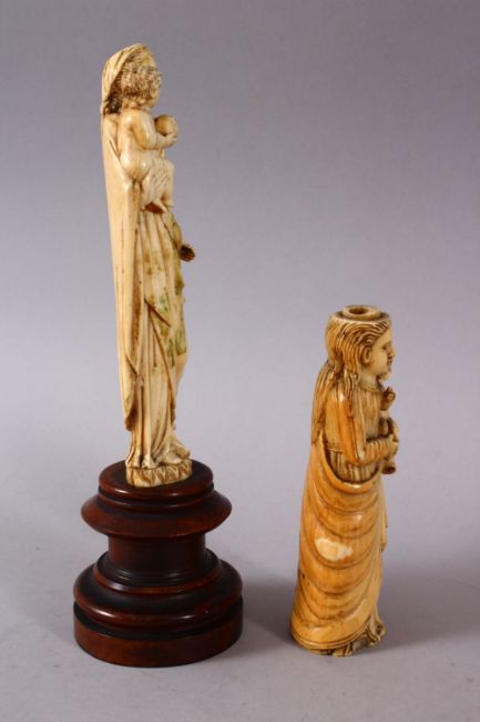 TWO 17TH / 18TH CENTURY GOAN CARVED IVORY RELIGIOUS FIGURES, Two figures both holding young, one mounted to a wooden base, 13.5cm & 22.5cm