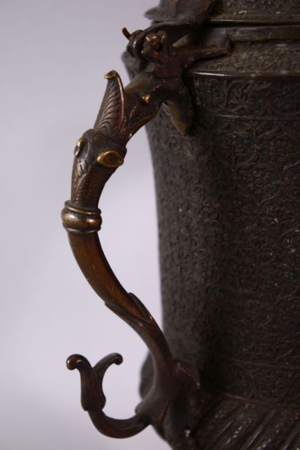 A 18TH/19TH CENTURY PERSIAN COPPER COFFEE POT, with liner, with twin hinged lid, pierced base, chased foliate body, 30cm high.