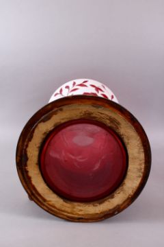 A LARGE DECORATIVE BOHEMIAN CUT GLASS FLORAL VASE, the large vase with floral decoration in pin and white, with a cylindrical wooden base encasing the vase, the base is glass, 47cm x 27cm.
