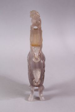 A CHINESE CARVED AGATE VASE AND COVER, with four carved lion dog head handles and rings, stood upon four carved feet, with a lion dog finial, the cover glued, 19cm high x 13cm wide.