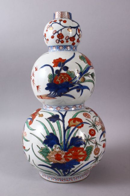A 18TH / 19TH CENTURY CHINESE FAMILLE VERTE TRIPLE GOURD PORCELAIN VASE, decorated with an array of native floral sprays, 41.5cm high