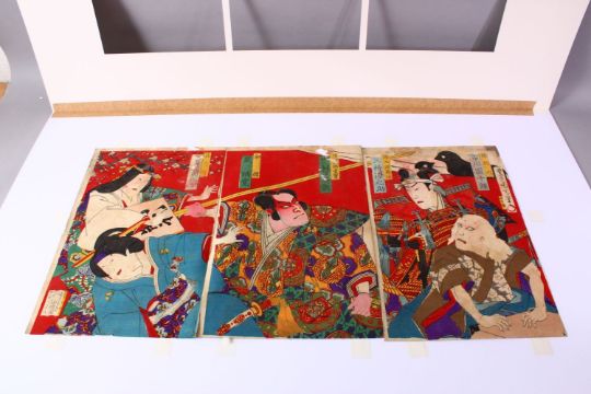 A JAPANESE MEIJI PERIOD WOOD BLOCK PRINT TRIPTYCH - KUNICHIKA TOYOHARA 1835 -1900 - KABUKI THEATRE PLAY - depicting five actors in play, mounted for framing, overall 100cm x 59cm.