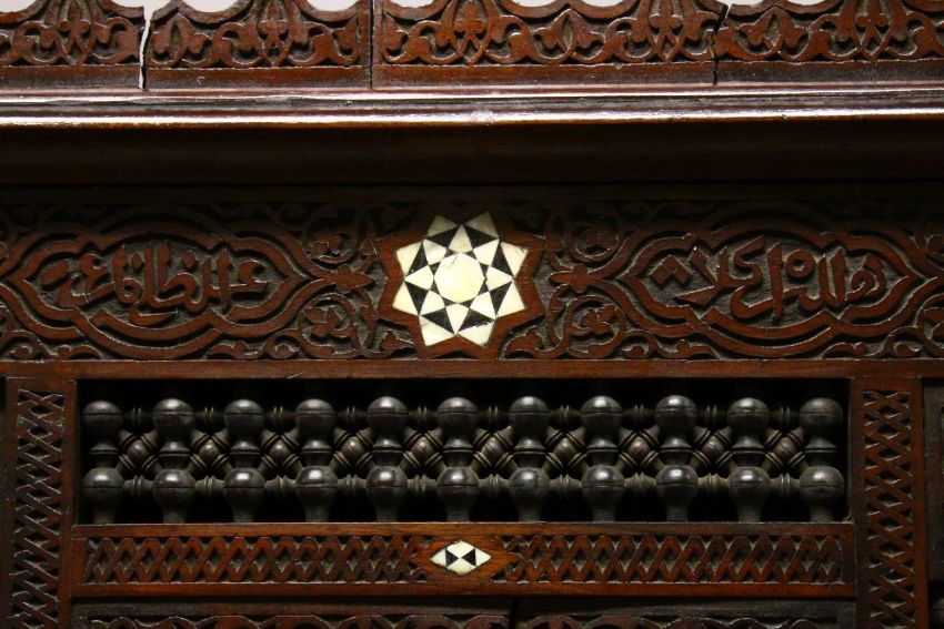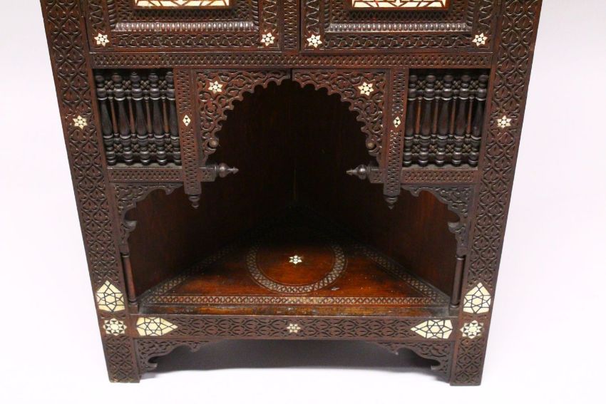 A LATE 19TH CENTURY MOORISH STANDING CORNER CABINET, profusely carved decoration, inlaid and inset with mother of pearls and mashrabia work panels, with a pair of doors and open display sections, 191cm high, 69cm wide, 30cm deep.