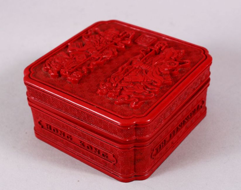 A CHINESE RED CINNABAR LACQUER BOX & COVER, the cover decorated with two warriors and a four character mark, upon a key stippled ground, the sides reading " the peninsula " " Hong Kong" 10cm square,