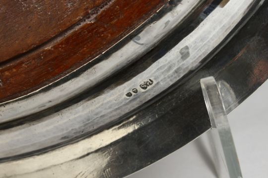 A SUPERB GEORGE III SILVER CIRCULAR TWO HANDLED TEA TRAY, with wooden base, reeded edge and engraved decoration, large central crest, 18 ins. diameter,