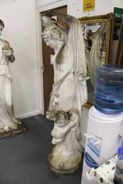 A GOOD ITALIAN CARVED WHITE MARBLE CLASSICAL FEMALE FIGURE, a drape over her semi naked body, holding a bunch of grapes on her head, roses in her hair, a cupid at her feet.