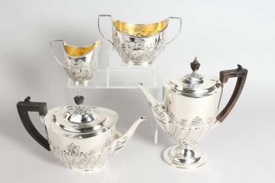 A GOOD VICTORIAN FOUR PIECE SILVER TEA SET, teapot, hot water jug, sugar basin and milk jug.